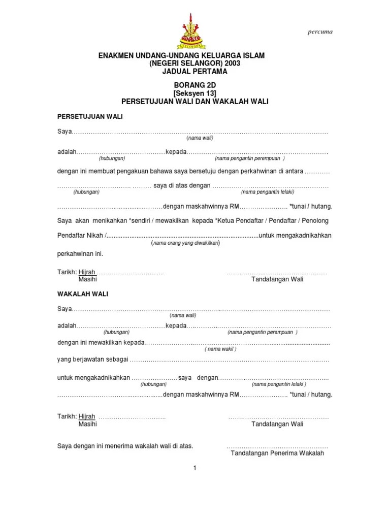 Surat wakalah wali sekiranya wali tidak hadir. Borang wali 2d pdf google drive. Sebagaimana di dalam senarai semak bno bersama dengan borang permohonan. You have just read the article entitled borang wakalah wali kelantan. Dapatkan borang berikut daripada penolong pendaftar nikah, cerai & rujuk (imam.